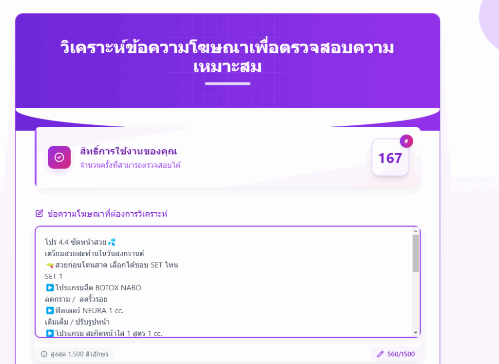 วิเคราะห์ข้อความเพื่อตรวจสอบความเหมาะสมและความเสี่ยงตามมาตรฐานและกฎหมายไทย รองรับทั้งภาษาไทย ตรวจจับคำหยาบและความเสี่ยง รายงานผลละเอียด พร้อมแนะนำ