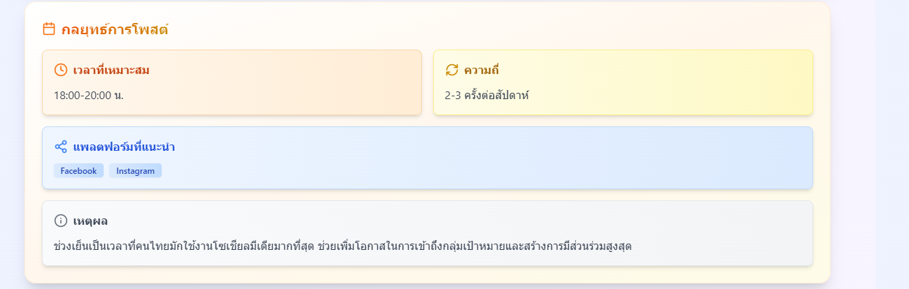 วิเคราะห์เนื้อหาสำหรับโซเชียลมีเดีย พร้อมคำแนะนำเพื่อเพิ่มประสิทธิภาพการเข้าถึง แนะนำกลยุทธ์การโพสต์ วิเคราะห์กลุ่มเป้าหมาย ปรับปรุงเนื้อหาให้อัตโนมัติ